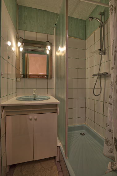 *BATHROOM with shower, washbasin, WC.