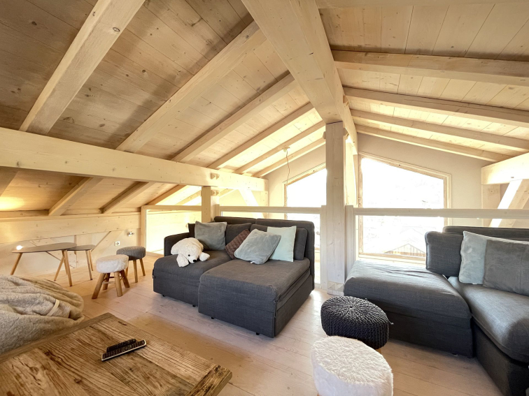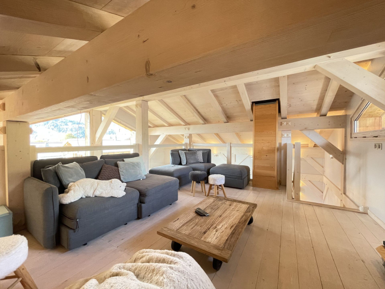 *1ST FLOOR : kitchen open on the living room with ceramic hobs, oven, microwave oven, dishwasher, fridge, Nespresso coffe macchine ; very bright living room with sofa, television, DVD, anf fire place log. The floor is open on to a balcony facing SOUTH/WEST with superb view on the Mont Charvin and the village.