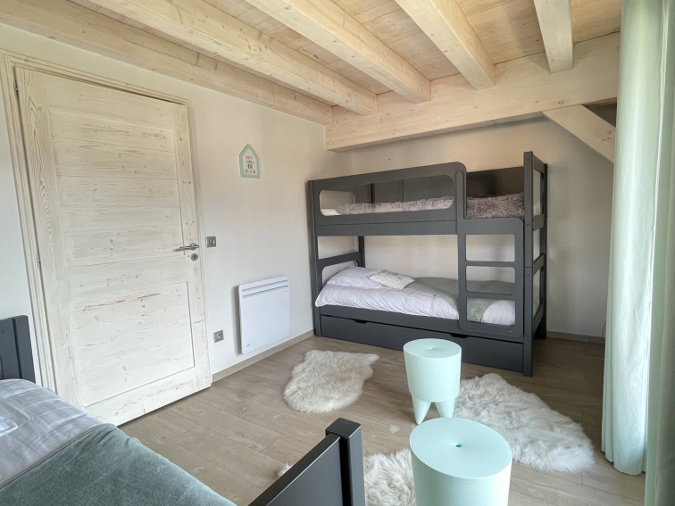 *GROUNDFLOOR : entrance ; guest toilets ; one bedroom with bunk beds, one drawer bed, one single bed (4x90) open on to a balcony ; one double in suite bedroom (bed of 160) with bathroom (bath) open on to a balcony.