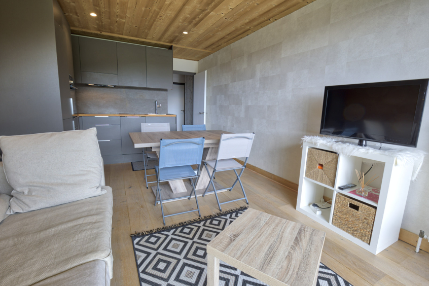 Apartment LEBERT. Les ALPAGES 3. 3 rooms, 6 persons, 43 sqm, 3rd floor, balcony SOUTH exposure, open view on the village, the Mont Charvin and the valley. Ski-in/ski-out!