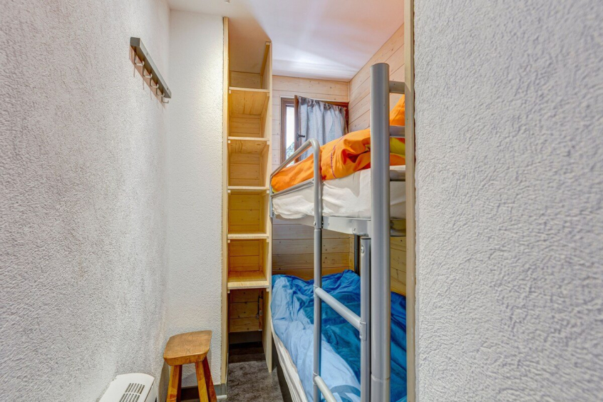 - a bedroom area with a 2-bed bunk bed and storage space.
