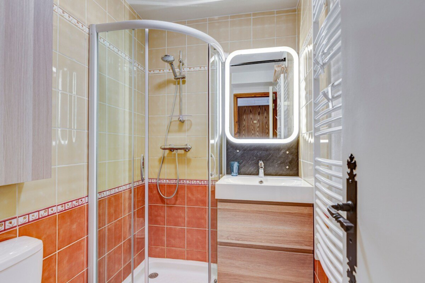 - a bathroom with shower, sink unit, toilet and heated and blown towel rail.