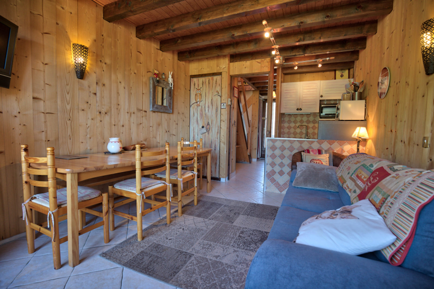- Couchages : une chambre avec un lit double (140), chambre sur mezzanine avec deux lits simples (2x90), séjour avec un canapé-lit deux personnes (140). Literie équipée de couettes.