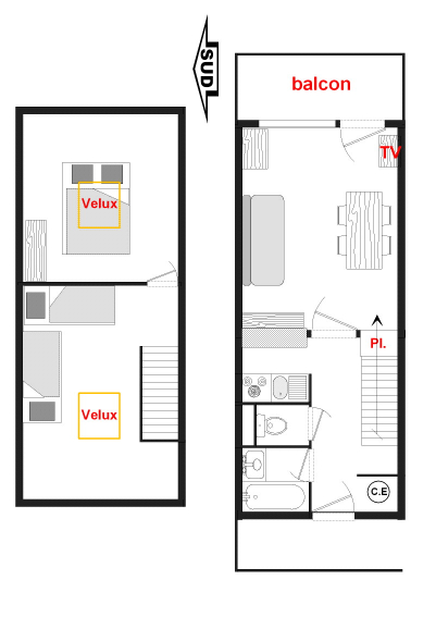 Appartement en duplex pour six personnes d'une surface de 32 m². Situé au premier étage avec un balcon en exposition ouest et vue sur le Mont Charvin.