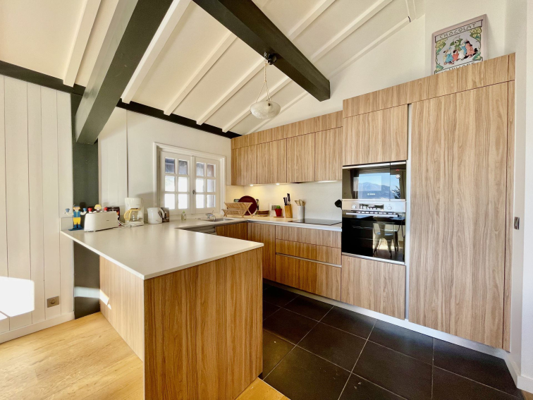 - grande pièce à vivre avec cuisine toute équipée (plaques induction : quatre feux, four, micro-ondes, lave-vaisselle, réfrigérateur), poêle à bois, canapé convertible deux places (140), télévision écran plat,