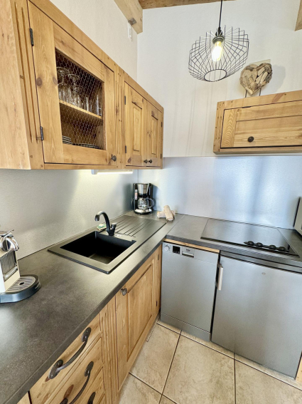 - Séjour avec télévision écran plat avec cuisine ouverte équipée : 4 plaques vitrocéramiques, micro-ondes, réfrigérateur, lave vaisselle.