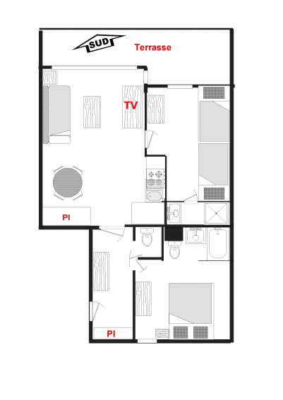 - Couchages : une chambre en suite avec un lit double (160) et salle de bains avec baignoire et toilettes; une chambre avec deux lits simples (2x90)et salle de douche ; séjour avec un canapé-lit deux personnes (160). Literie équipée de couettes.