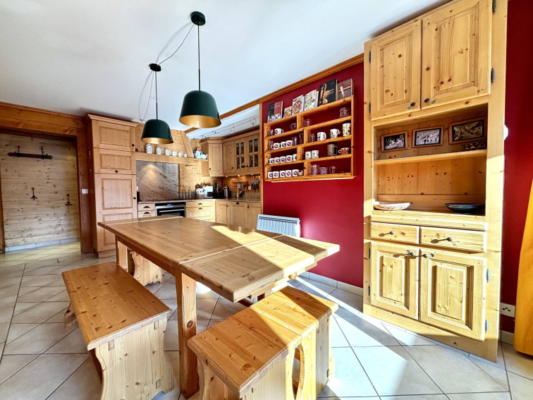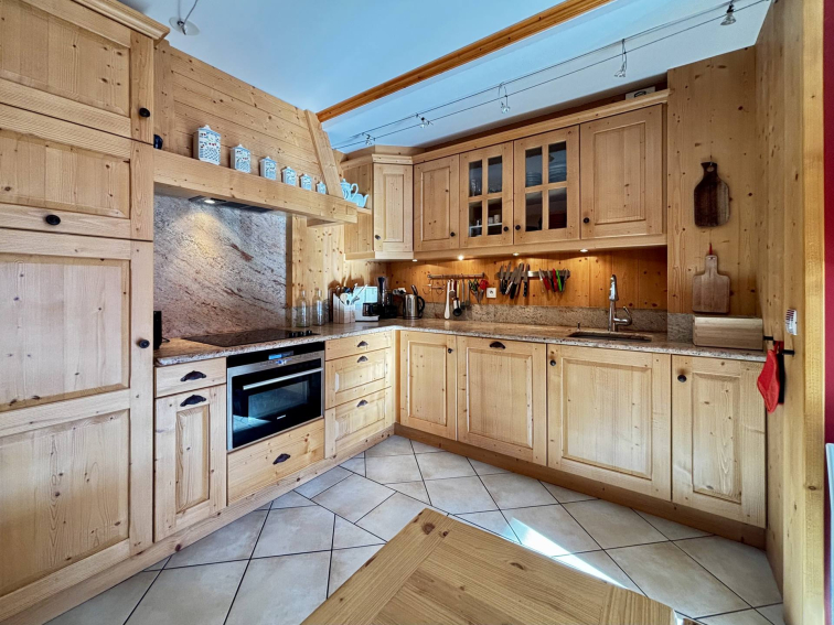 - Une cuisine entièrement équipée avec coin salle à manger, ouverte sur une première terrasse exposée sud-est, avec vue dégagée sur les montagnes et le village (four micro-onde, réfrigérateur, plaque vitrocéramique 3 foyers, lave-vaisselle, hotte).