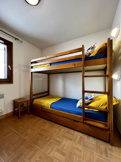 - Couchages : une chambre avec un lit double (140), une chambre avec lits superposés + un lit tiroir (3x90), séjour avec un lit gigogne (2x90). Literie équipée de couvertures.