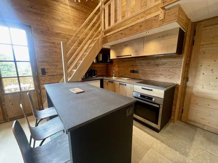 Une pièce à vivre avec cuisine ouverte équipée : plaques à induction, four, micro-ondes, réfrigirateur et lave-vaiselle, et un espace salon. Vous trouverez au même niveau une chambre double (lit de 160) avec rangements, une salle de bains avec douche.