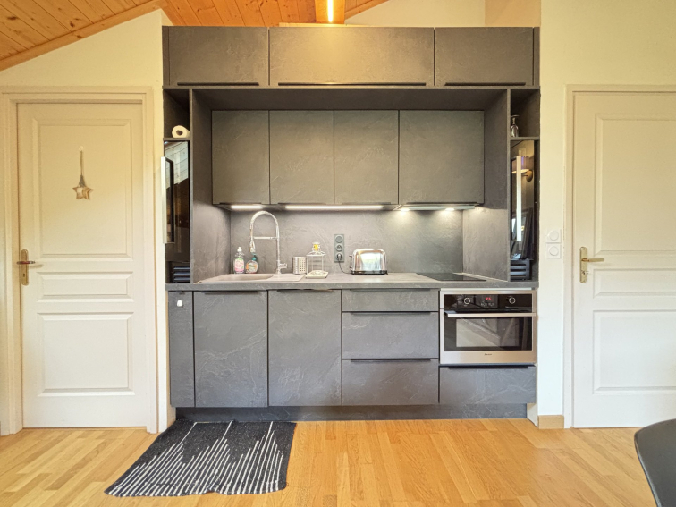 - Une spacieuse et lumineuse pièce à vivre avec cuisine ouverte équipée : lave-vaiselle, four combiné micro-ondes, plaques à induction, réfrigérateur, deux petites caves à vin.