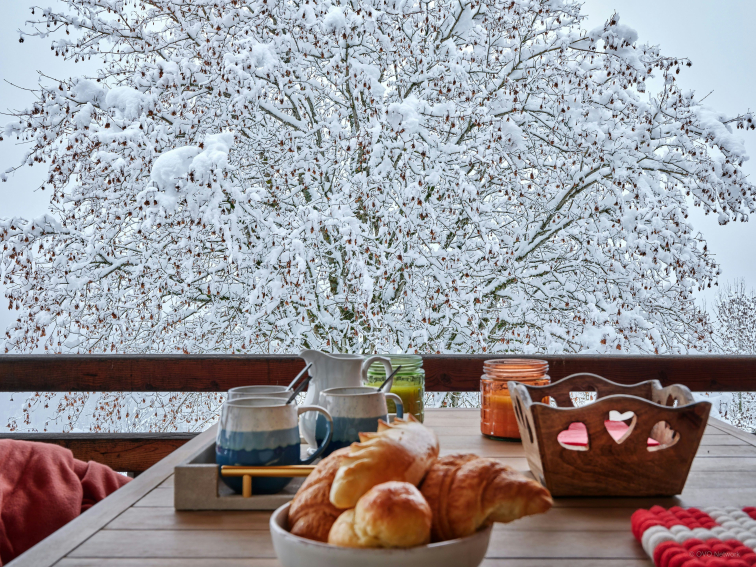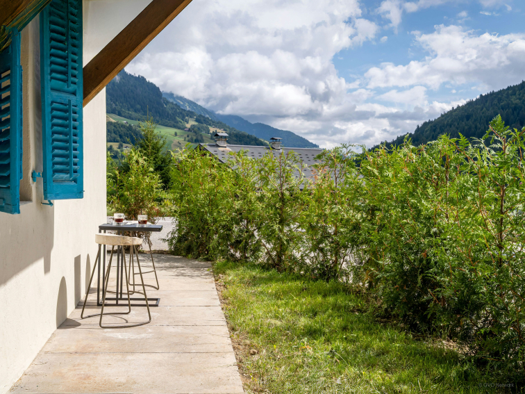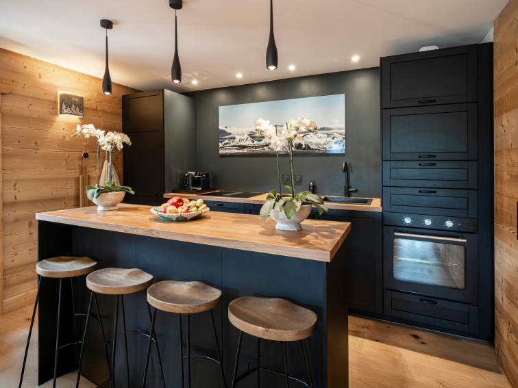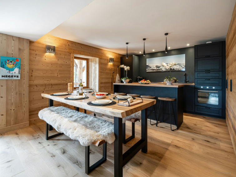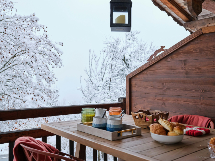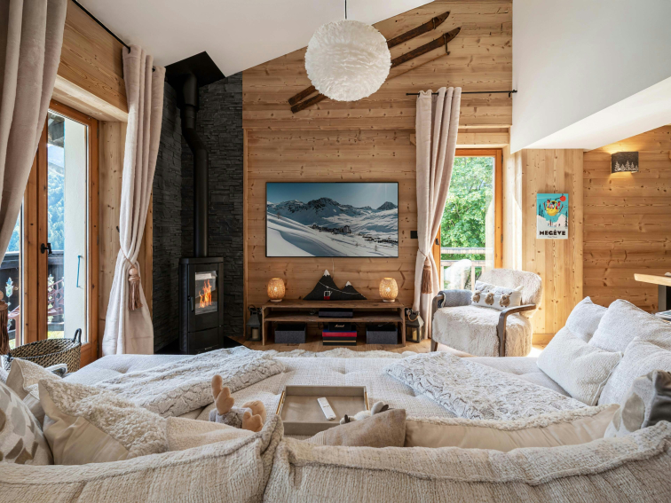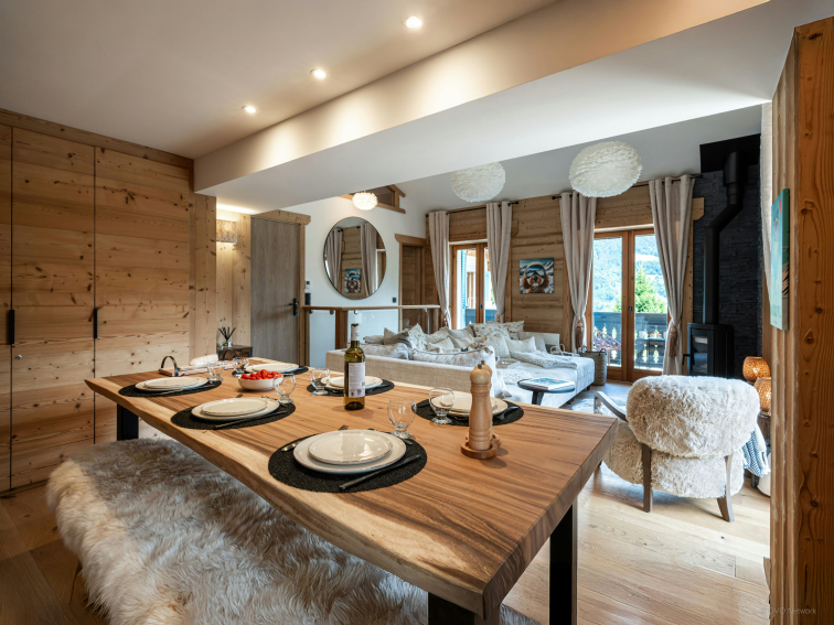 Deux balcons prolongent cet espace. L’un invite à dîner en plein air, tandis que l’autre offre deux fauteuils tournés vers les sommets du Val d’Arly, parfaits pour savourer un café ou un moment de détente.