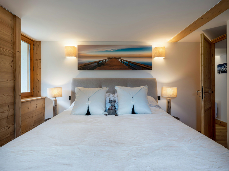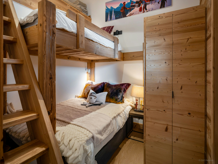 Une première chambre avec un lit de 130 cm et un lit superposé se trouve à ce niveau. Le lit superposé comprend un couchage inférieur (petit lit double) et un couchage supérieur (lit simple) — les deux couchages sont utilisables. En revanche, il existe une troisième plateforme aménagée sous les combles avec un matelas qui ne doit en aucun cas être utilisée comme couchage.