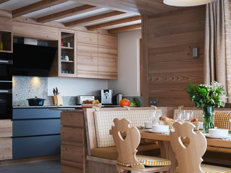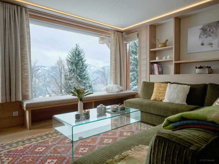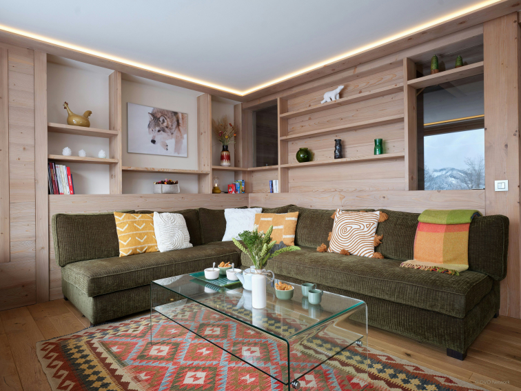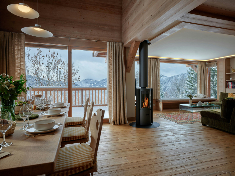 Vous pénétrez ensuite dans une agréable pièce de vie, composée de teintes douces et réchauffée par un poêle à bois central. Le salon et le balcon offrent une vue absolument spectaculaire sur la chaîne des Aravis.