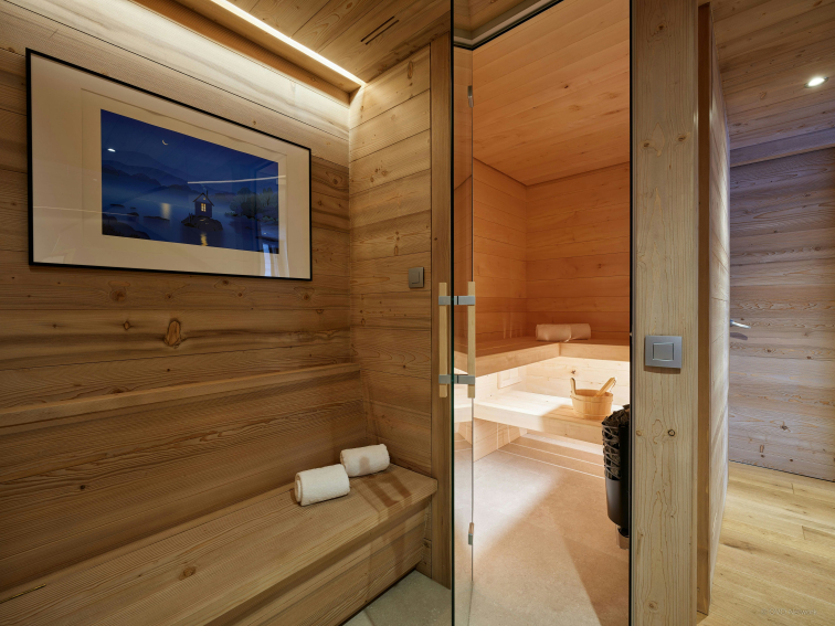 Parmi les pièces communes, vous trouverez une salle de télévision et une salle de jeux sous la charpente, ainsi qu’un agréable sauna pour vous ressourcer et éliminer les toxines.