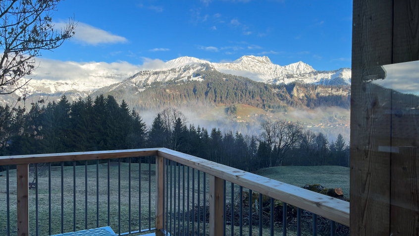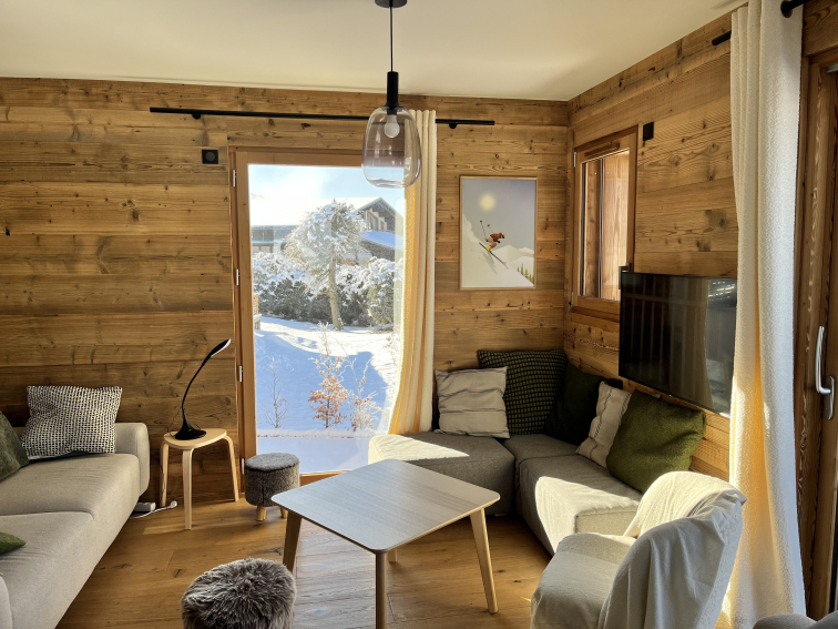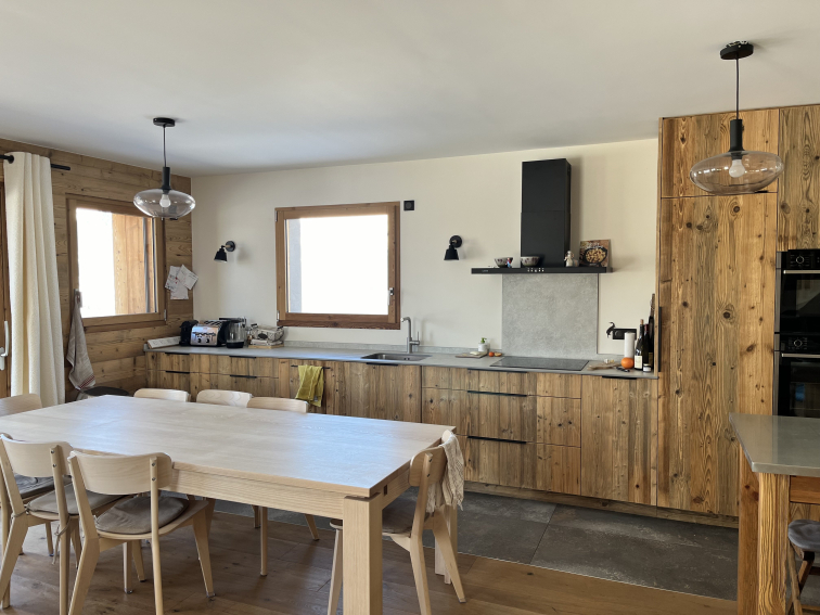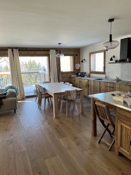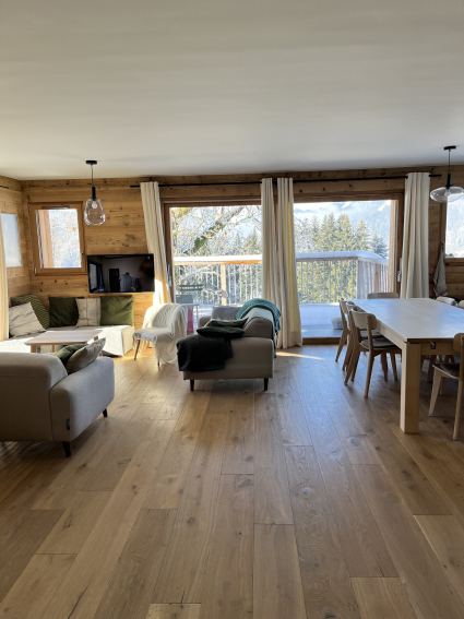 Chalet familial neuf, 4 chambres+ dortoirs 4 lits, confortable et cosy, à Crest Voland, centre village, au calme, vue Aravis et Charvin. orientation Est/Sud/Ouest, très lumineux.